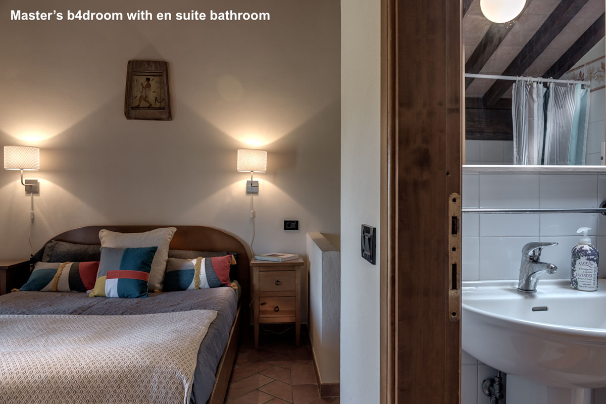 La camera matrimoniale si trova in mansarda ed è aperta sul vano scala con mezza parete (non esiste la porta). Le altre due camere da letto, situate al primo piano, hanno invece porte regolari.